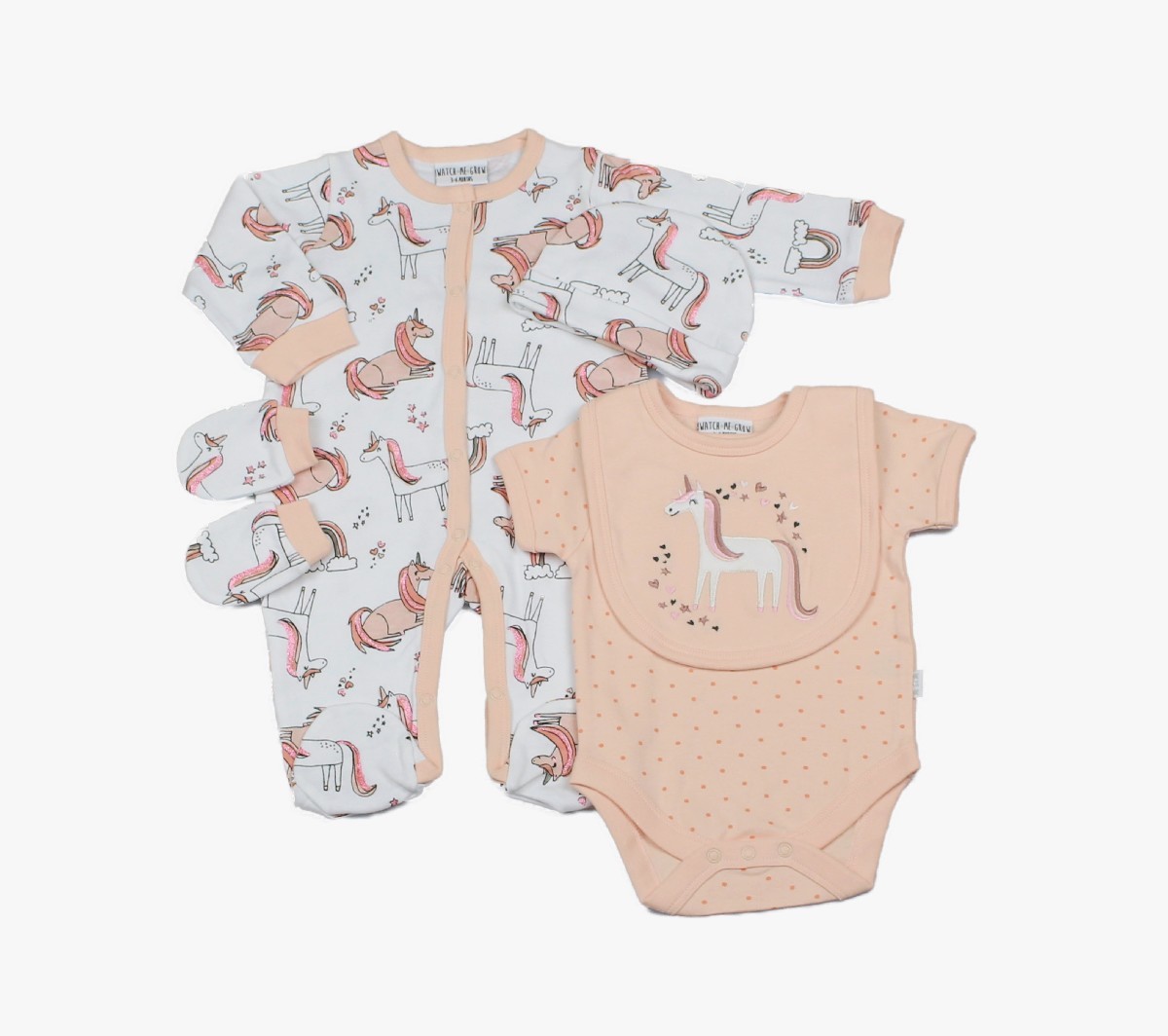 5pc gift set, Neon Unicorn print, sleepsuit, bodysuit, bib, cap and mitts gift packed in a mesh bag